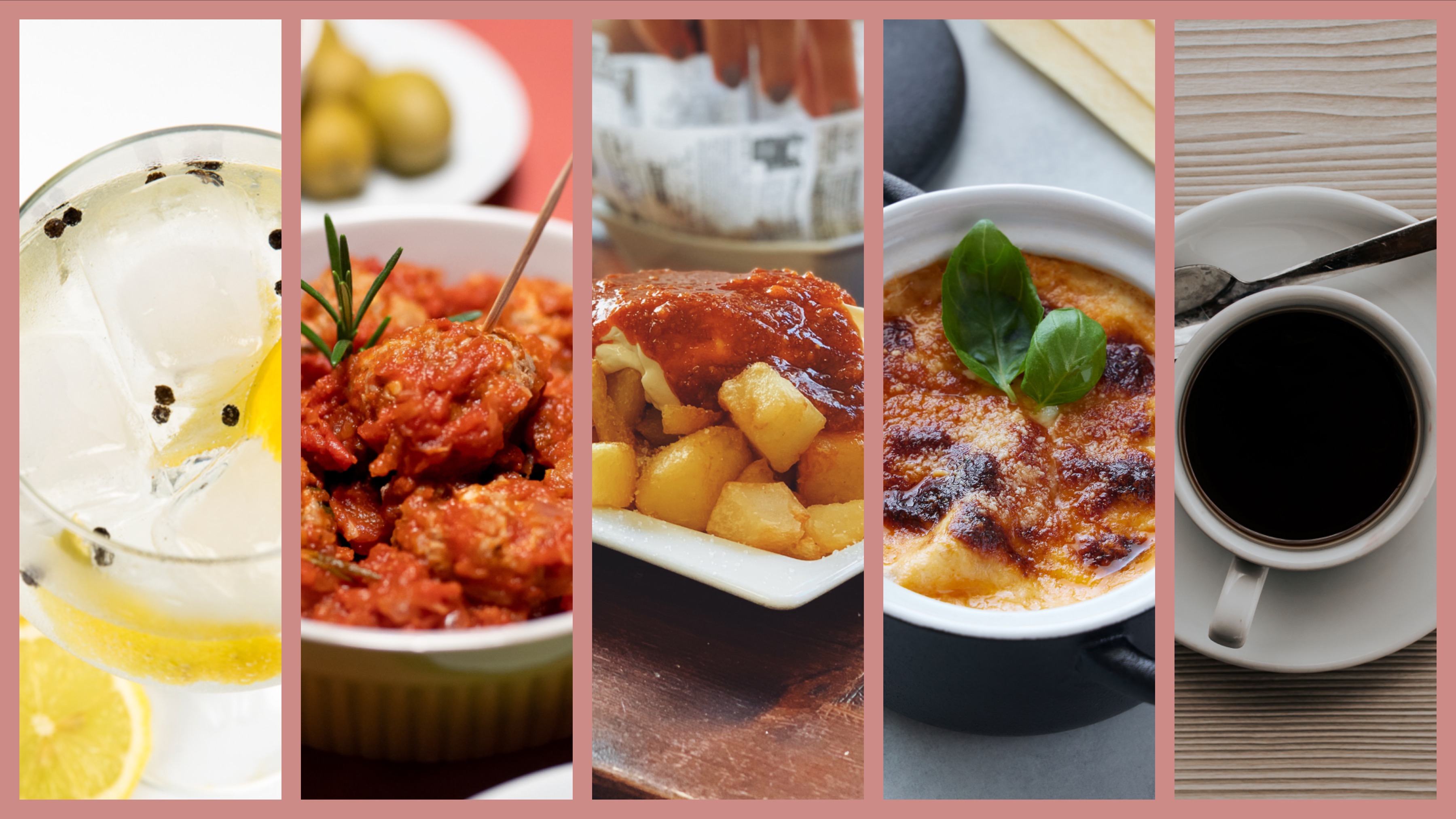 Tapas calientes (warm): albóndigas (gehakballetjes), tortilla, scampi in look, patatas bravas, gevulde paprika